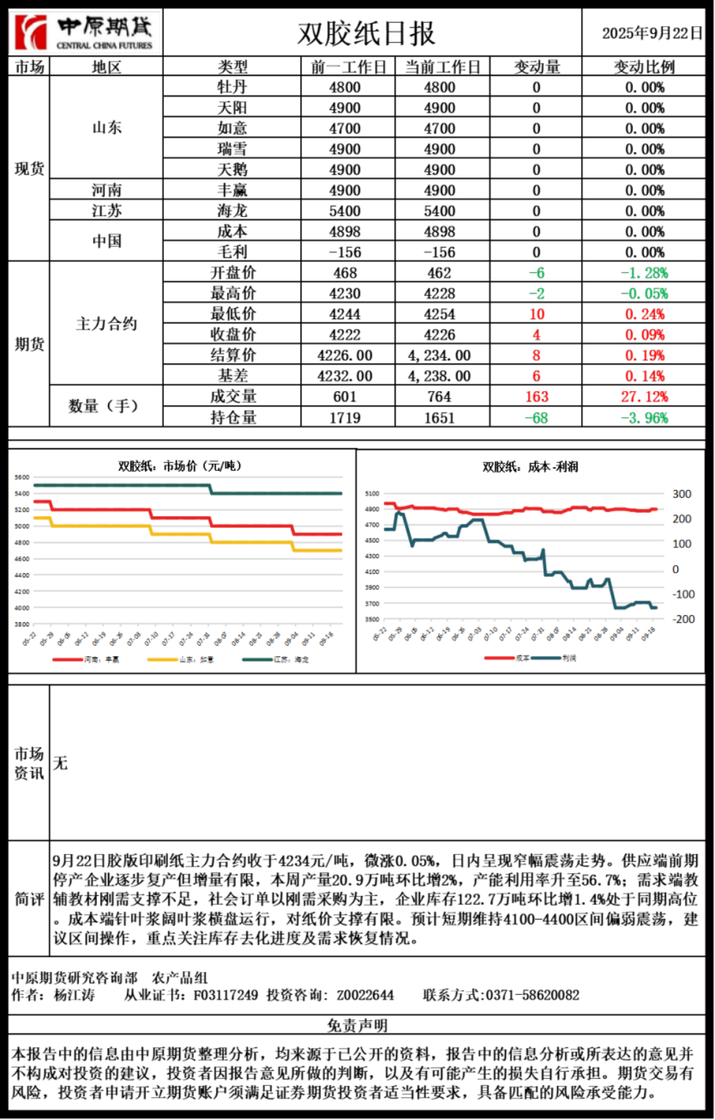 双胶纸日报20250922