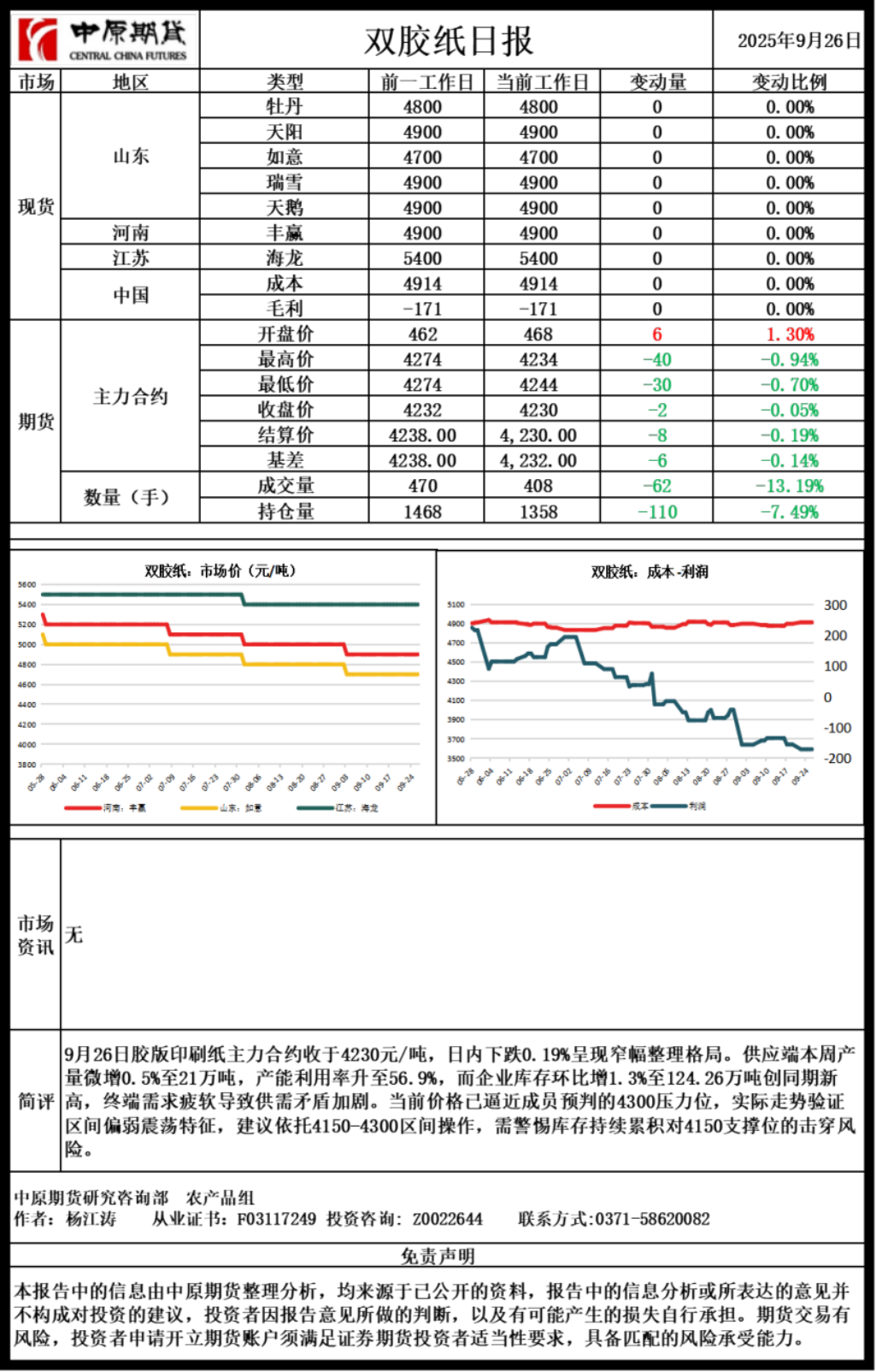 双胶纸日报20250926