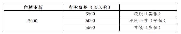 同样假设白糖市场价格为6000元/吨,还是用这一判断原则去想:对于行权价格为6500元/吨的看跌期权,如果我立刻行权,那就意味着我能以6500元/吨的价格卖出价值只有6000元/吨的白糖,立刻行权是赚钱的,所以该期权是实值期权;对于行权价格为6000元/吨的看跌期权,如果我立刻行权,那就意味着我可以6000元/吨的价格卖出价值等于6000元/吨的白糖,立刻行权是不赚也不亏的,所以该期权是平值期权;