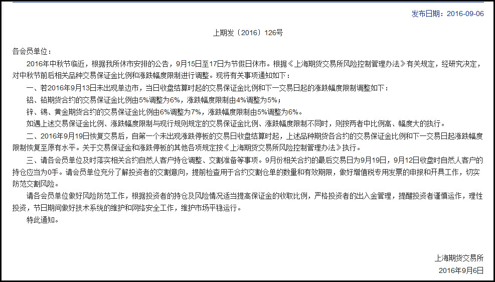 下一篇:转发大商所关于2016年中秋节放假期间调整各品种最低交易保证金标准和涨跌停板幅度及夜盘交易时间的通知