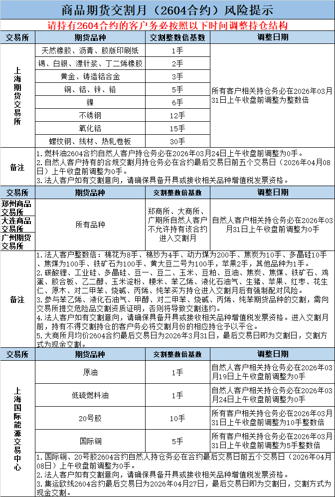 尊敬的客户:本月最后交易日为0331日,如您持有商品期货2604合约(燃料油、原油、低硫燃料油合约除外),请务必在0331上午收盘前按交易规则调整持仓结构,具体规则详见下表。我司将于0331下午开盘后对违规持仓进行处理,感谢您的配合!